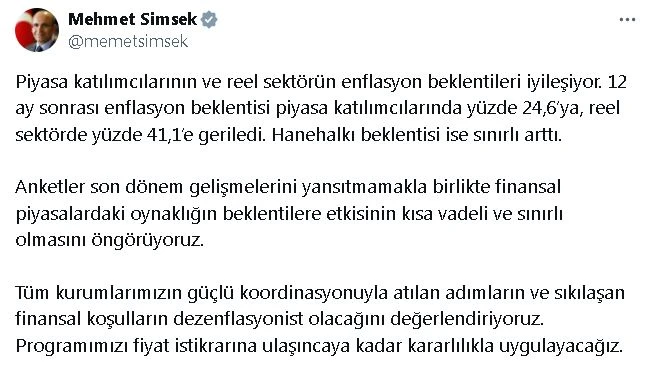 Hazine ve Maliye Bakanı Şimşek, sektörel enflasyon beklentilerine ilişkin sosyal medya hesabından yaptığı açıklamada, "Piyasa katılımcılarının ve reel sektörün enflasyon beklentileri iyileşiyor. 12 ay sonrası enflasyon beklentisi piyasa katılımcılarında yüzde 24,6'ya, reel sektörde yüzde 41,1'e geriledi. Hanehalkı beklentisi ise sınırlı arttı. Anketler son dönem gelişmelerini yansıtmamakla birlikte, finansal piyasalardaki oynaklığın beklentilere etkisinin kısa vadeli ve sınırlı olmasını öngörüyoruz. Tüm kurumlarımızın güçlü koordinasyonuyla atılan adımların ve sıkılaşan finansal koşulların dezenflasyonist olacağını değerlendiriyoruz. Programımızı fiyat istikrarına ulaşıncaya kadar kararlılıkla uygulayacağız" ifadelerini kullandı.