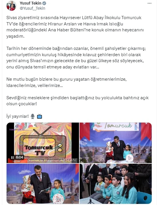 Öte yandan Bakan Yusuf Tekin Osman Çelik'in kurduğu Tomurcuk TV'ye yaptığı ziyaretteki anlarını sosyal medya hesabından da paylaştı. paylaşımında şu ifadelere yer verdi; "Sivas ziyaretimiz sırasında Hayırsever Lütfü Abay İlkokulu Tomurcuk TV’de öğrencilerimiz Hiranur Arslan ve Havva Irmak Islıoğlu moderatörlüğündeki Ana Haber Bülteni’ne konuk olmanın heyecanını yaşadım. Tarihin her döneminde bağrından ozanlar, önemli şahsiyetler çıkarmış; cumhuriyetimizin kuruluş hikâyesinde kılavuz şehirlerden biri olarak yerini almış Sivas’ımızın gelecekte de bu güzel ülkeye söz söyleyecek, onu dünyada temsil etmeye aday evlatları var… Ne mutlu bugün bizlere bu gururu yaşatan öğretmenlerimize, idarecilerimize, velilerimize… Sevdiğiniz mesleklere şimdiden başlattığınız bu yolculukta bahtınız açık olsun çocuklar! İyi yayınlar!