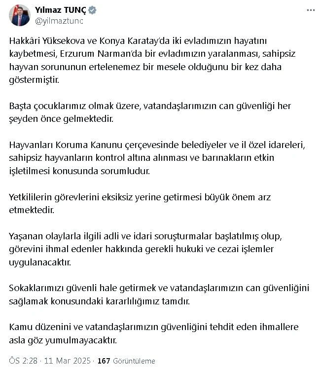 Adalet Bakanı Yılmaz Tunç, sosyal medya hesabından yaptığı açıklamada, "Hakkari Yüksekova ve Konya Karatay'da iki evladımızın hayatını kaybetmesi, Erzurum Narman'da bir evladımızın yaralanması, sahipsiz hayvan sorununun ertelenemez bir mesele olduğunu bir kez daha göstermiştir. Başta çocuklarımız olmak üzere, vatandaşlarımızın can güvenliği her şeyden önce gelmektedir. Hayvanları Koruma Kanunu çerçevesinde belediyeler ve il özel idareleri, sahipsiz hayvanların kontrol altına alınması ve barınakların etkin işletilmesi konusunda sorumludur. Yetkililerin görevlerini eksiksiz yerine getirmesi büyük önem arz etmektedir" dedi.