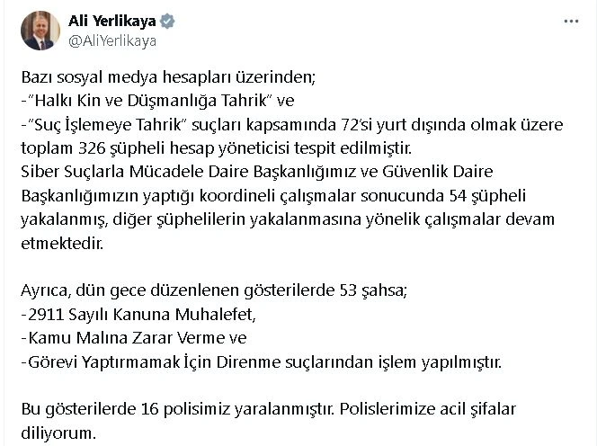Bakan Yerlikaya'nın sosyal medya hesabından yaptığı açıklamaya göre; bazı sosyal medya hesapları üzerinden 'Halkı kin ve düşmanlığa tahrik' ve 'Suç işlemeye tahrik' suçları kapsamında 72'si yurt dışında olmak üzere toplam 326 şüpheli hesap yöneticisi tespit edildi. Siber Suçlarla Mücadele Daire Başkanlığı ve Güvenlik Daire Başkanlığının çalışmaları ile 54 şüpheli yakalandı, diğer şüphelilerin yakalanmasına yönelik çalışmalar devam ediyor. Ayrıca dün gece düzenlenen gösterilerde 53 kişi hakkında '2911 sayılı Toplantı ve Gösteri Yürüyüşleri Kanunu'na muhalefet', 'Kamu malına zarar verme' ve 'Görevi yaptırmamak için direnme' suçlarından adli işlem yapıldı. Bu gösterilerde 16 polis yaralandı.
