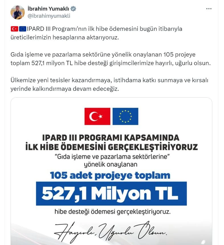 TARIM ve Orman Bakanı İbrahim Yumaklı, IPARD III Programı\'nın ilk hibe ödemesini bugün itibarıyla üreticilerin hesaplarına aktardıklarını belirterek, \"105 projeye toplam 527,1 milyon TL hibe desteği girişimcilerimize hayırlı, uğurlu olsun\" dedi.