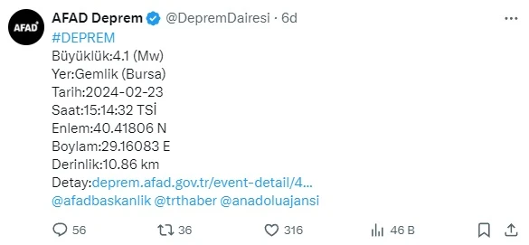10.86 kilometre derinlikte oluşan sarsıntı megakent İstanbul ve çevre illerde de hissedildi. AFAD'ın Bursa Gemlik merkezli depreme ilişkin paylaşımı şu şekilde;