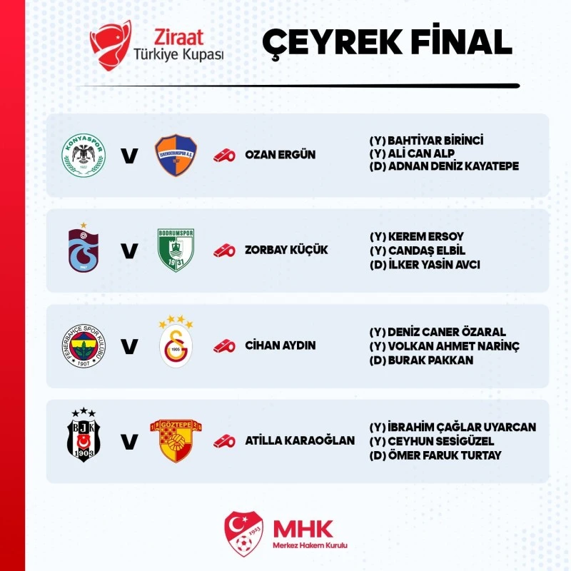 Türkiye Kupası'nda Fenerbahçe'nin Galatasaray'ı konuk edeceği çeyrek final karşılaşmasını Cihan Aydın yönetecek.