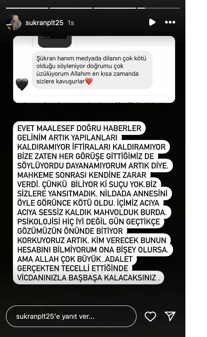 "Evet maalesef doğru haberler gelinim artık yapılanları kaldıramıyor, iftiraları kaldıramıyor bize zaten her görüşe gittiğimiz de söylüyordu dayanamıyorum artık diye. Mahkeme sonrası kendine zarar verdi. Çünkü biliyor ki suçu yok. Biz sizlere yansıtmadık."