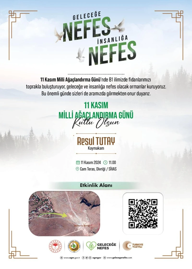 11 Kasım Milli Ağaçlandırma Günü dolayısıyla Divriği Kaymakamı Resul Tutay vatandaşları fidan dikim etkinliğine davet etti.