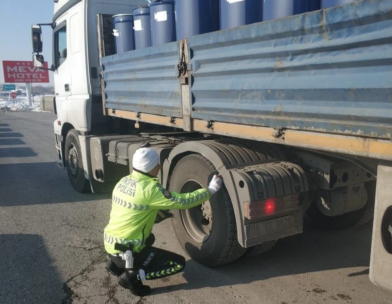 Öte yandan sürücülerin ve yolcuların can güvenliği açısından önem arz eden uygulamayla ilgili soğuk hava şartlarında, karlı ve buzlu yollarda güvenli bir trafik ortamının sağlanması, uygunsuz lastik kullanımından kaynaklı ölüm ve yaralanmaların en aza indirilmesi ve denetim faaliyetleri yoluyla sürücüler üzerinde denetim algısı oluşturmak amacıyla yapılan denetimlerde şehirlerarası yük ve yolcu taşıyan ticari araç lastiklerinin diş derinlikleri kontrol edildi.