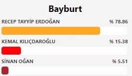2023 Cumhurbaşkanlığı seçimlerinde sandıkların yüzde 99'u açılırken; Cumhurbaşkanı Erdoğan'ın oy oranı yüzde 49.37, Kemal Kılıçdaroğlu'nun oy oranı yüzde 44.99, Sinan Oğan'ın oy oranı ise yüzde 5.21 olarak görülüyor. Erdoğan seçimde en yüksek oyu yüzde 78.86 ile Bayburt'tan aldı. Cumhurbaşkanı'nın memleketi Rize'den aldığı oy oranı ise yüzde 72.79.