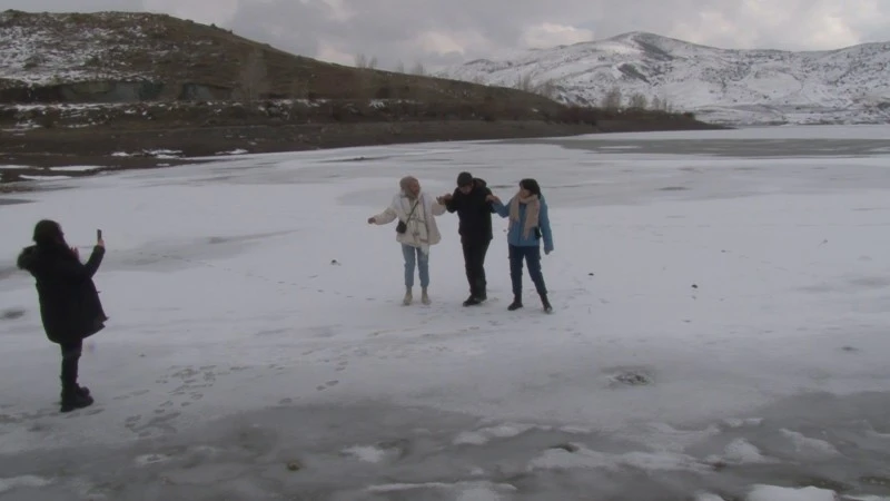 Gölette oluşan buz tabakasının üzerinde halay çektiklerini belirten Ayşegül Kuşkaya, “Şuan Sivas’ın Yıldız beldesinde bulunuyoruz. Yıldız dağına giderken göletin donduğunu fark ettik. Gölet oldukça fazla şekilde buz tutmuş. Şuan burada eksi on derece bir hava var. Gölete taş attık, buz kırılmadı. Üzerine çıktık, halay çektik. Gölet yüzeyini kaplayan buz oldukça kalın kırılmıyor” dedi.