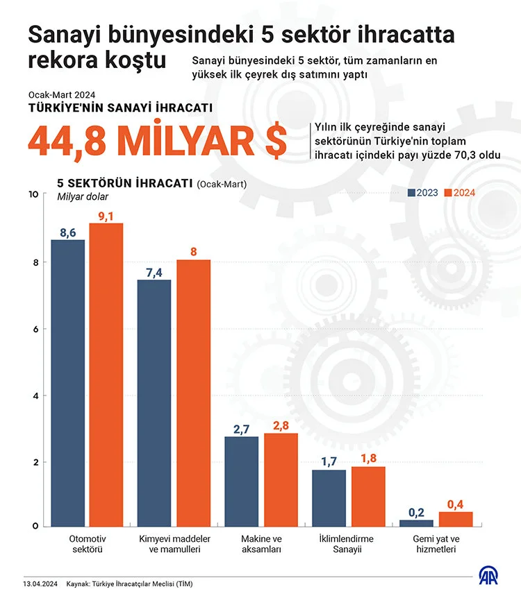Ülkenin sanayi ihracatı ise bu dönemde yüzde 1,2 artışla 44,8 milyar dolara çıktı. Sanayi ihracatında bazı alt sektörlerde rekor kırıldığı görüldü.