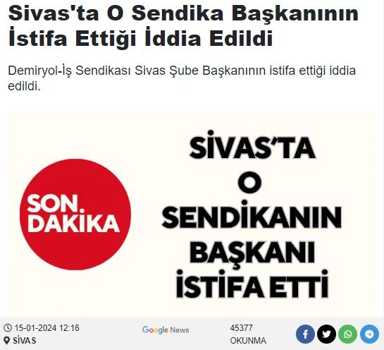 Sivas Ekspres Gazetesi olarak 15 Ocak’ta Sivas Demir Yol-İş Sendikası Başkanı Murat Kütük’ün istifa edeceğini duyurmuştuk. Kütük’ün istifasının ardından sendikanın yeni başkanı belli oldu.
