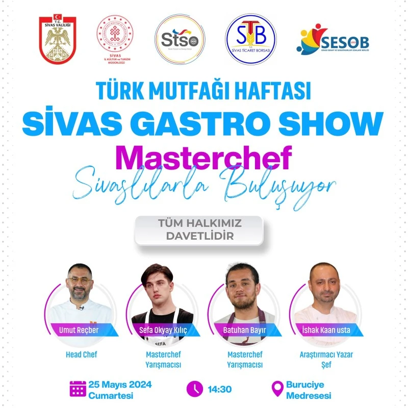 Ünlü şefler Umur Reçber, Sefa Oktay Kılıç, Batuhan Bayır, İshak Kaan Usta Sivaslılar ile buluşacak. Programda lezzetli yemekler pişirilecek, Türk mutfağının zenginliği tanıtılacak. Vatandaşlar Masterchef şefleriyle sohbet etme imkanı olacak ve eğlenceli yarışmalar düzenlenecek.