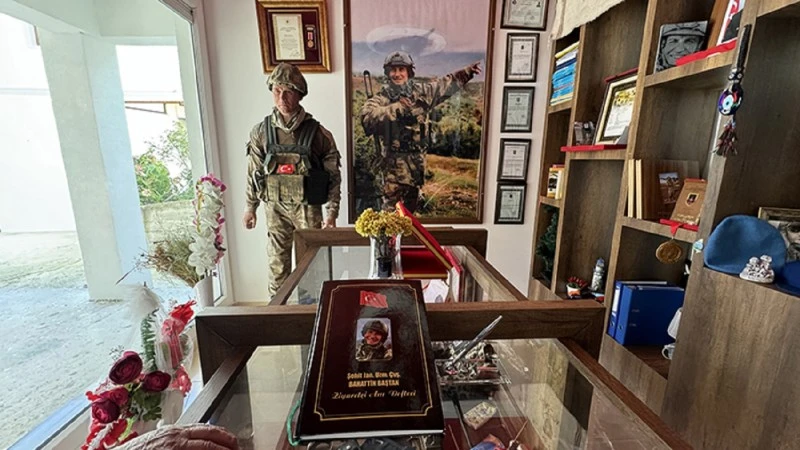 Baştan, tavanı ay yıldızlı bayrak haline getirilen binada, oğlunun kıyafetlerini, eşyalarını, üniformasını, bot, bere ve kasatura gibi askeri malzemelerini, görevde çekilmiş fotoğraflarını ve başarı belgelerini bir araya topladı.