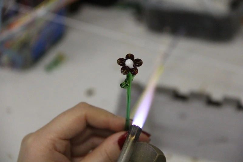 1500 derecelik ısı da cam şekillendirdiklerini anlatan Cıbır “Cama şekil verme kesme ve alev olarak ayırıyoruz. Alev de şekillendirme çalışmalarımız var. Ortalama 1500 derecelik bir alevimiz var ve özel üretim çubuklarımız var o çubukları eriterek ateşin içinde tekrar şekillendiriyoruz daha sonra soğumaya bırakıyoruz. Kesme de de yine özel plaka camlarımız var renkli plakalar bu plakaları elmaslar ile kesip şekillendirdikten sonra camların üzerine yerleştirerek fırında pişirerek ürün çıkartıyoruz ” ifadelerini kullandı.