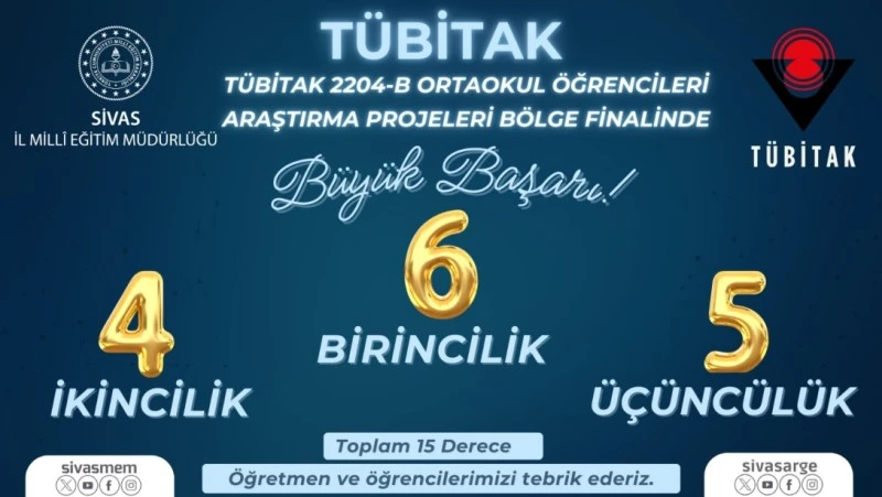 Sivas, toplam 100 projenin yarıştığı TÜBİTAK 2204-B Ortaokul Öğrencileri Araştırma Projeleri Yarışması Kayseri Bölge Finali'nde ödülleri topladı. Nevşehir'de gerçekleştirilen bölge finaline 36 proje ile katılım sağlayan öğrenciler, 6 birincilik, 4 ikincilik ve 5 üçüncülük olmak üzere toplam 15 derece elde etti.