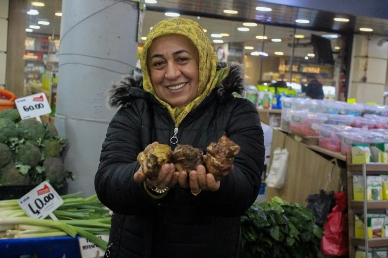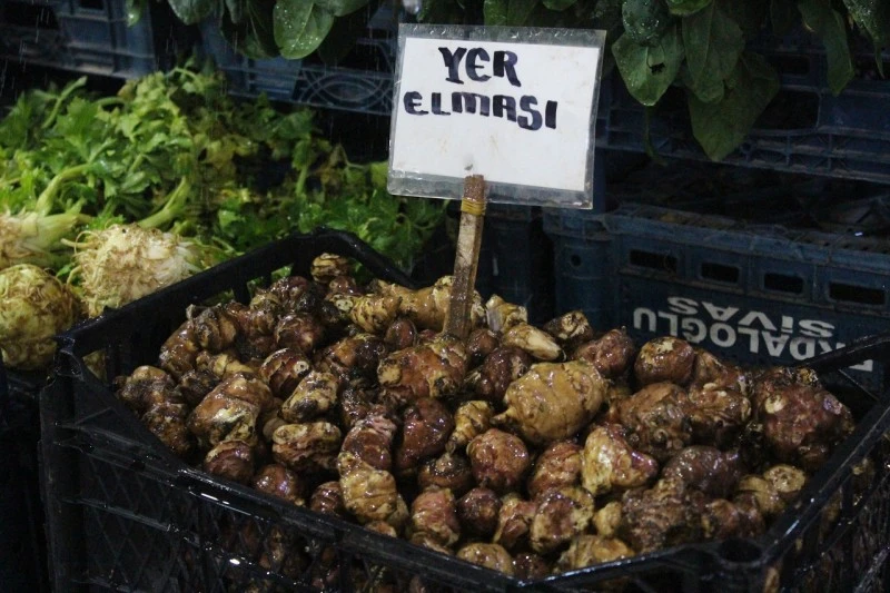 Kış aylarında yer elmasının pazarlarda sebze ve meyvelerden daha çok talep gördüğünü ifade eden Ethem Yıldız, “Ocak ayında toprak altından kazılarak toplanır. Sivas’ın bazı yerlileri ve başka illerden gelenler yer elmasının ne olduğunu biliyorlar buraya gelip almak istiyorlar. İstanbul İzmir gibi illerimize de kargo ile yer elmalarımızı gönderiyoruz. Şeker hastalığı gibi birçok hastalığa da iyi gelmektedir. Yer elmasının küçüklerini tekrardan toprağa gömerek tohum olarak kullanılabilir. Yer elması çok arsız bir meyvedir, tohuma veya gübreye gerek duymadan toprak altında da kendi kendine üreyerek çoğalabiliyor. Kış aylarında yer elmasına talep daha fazla, diğer sebze ve meyvelerden de daha fazla satılıyor. Biz de köylülerden alıyoruz, kilosunu da 50 liradan satıyoruz” dedi.
