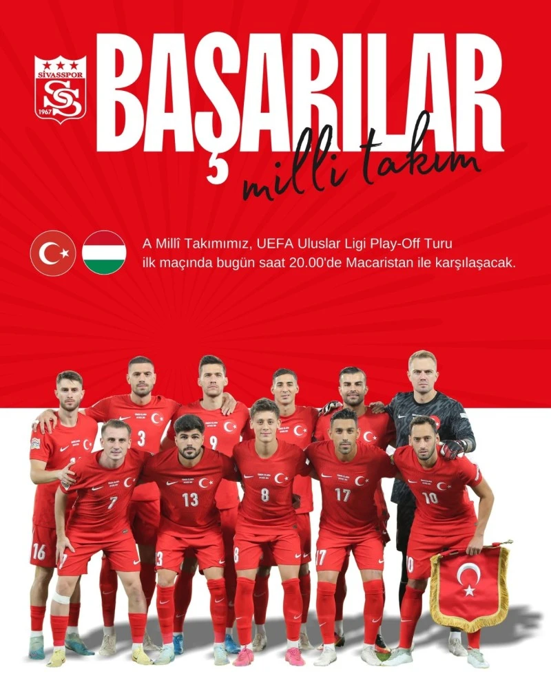 A Milli Futbol Takımı, UEFA Uluslar Ligi Play-Off Turu ilk maçında bugün Macaristan ile karşılaşacak. Sivasspor Kulübü de sosyal medya hesabı üzerinden paylaşımda bulunarak A Milli Takım\'a başarı mesajı yayımladı.