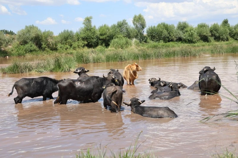 Kalın ve siyah derileriyle bilinen mandalar Türkiye’nin en uzun ırmağı olan Kızılırmak’a girerek serinledi.