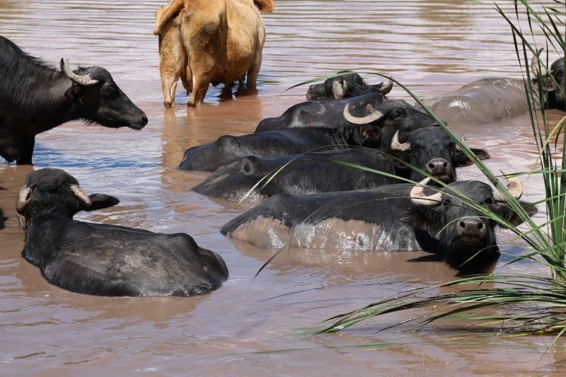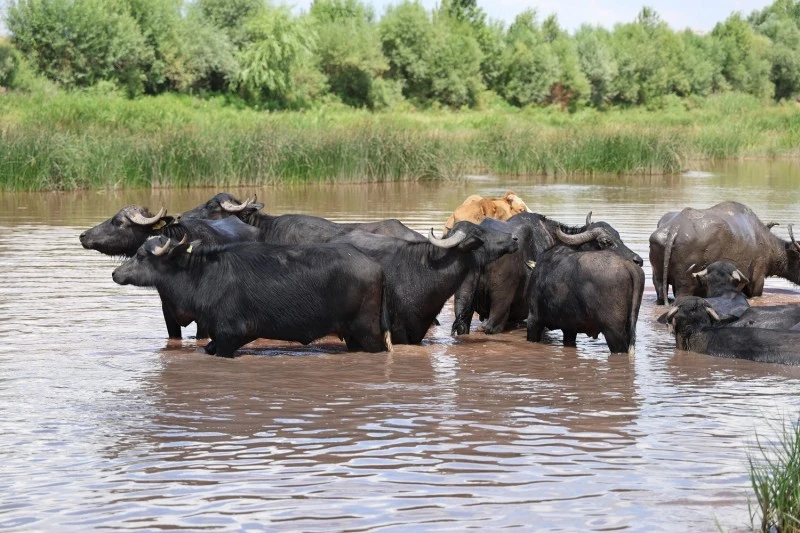 Irmağın serin sularına kendilerini bırakan mandalar ortaya Afrika belgesellerini aratmayan görüntüler çıkarttı.
