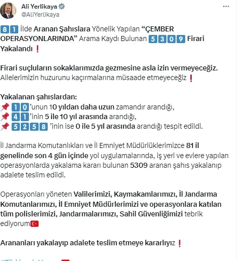 81 İlde aranan şahıslara yönelik yapılan “ÇEMBER OPERASYONLARINDA” Arama Kaydı Bulunan 5309 firari yakalandı. İçişleri Bakanı Ali Yerlikaya sosyal medya hesabından yaptığı paylaşımında operasyonun detaylarını paylaştı. Yerlikaya paylaşımında şu ifadelere yer verdi; “Firari suçluların sokaklarımızda gezmesine asla izin vermeyeceğiz. Ailelerimizin huzurunu kaçırmalarına müsaade etmeyeceğiz. Yakalanan şahıslardan: 10’unun 10 yıldan daha uzun zamandır arandığı, 41’inin 5 ile 10 yıl arasında arandığı, 5258’inin ise 0 ile 5 yıl arasında arandığı tespit edildi. İl Jandarma Komutanlıkları ve İl Emniyet Müdürlüklerimizce 81 il genelinde son 4 gün içinde yol uygulamalarında, iş yeri ve evlere yapılan operasyonlarda yakalama kararı bulunan 5309 aranan şahıs yakalanıp adalete teslim edildi. Operasyonları yöneten Valilerimizi, Kaymakamlarımızı, İl Jandarma Komutanlarımızı, İl Emniyet Müdürlerimizi ve operasyonlara katılan tüm polislerimizi, Jandarmalarımızı, Sahil Güvenliğimizi tebrik ediyorum. Arananları yakalayıp adalete teslim etmeye kararlıyız.’’