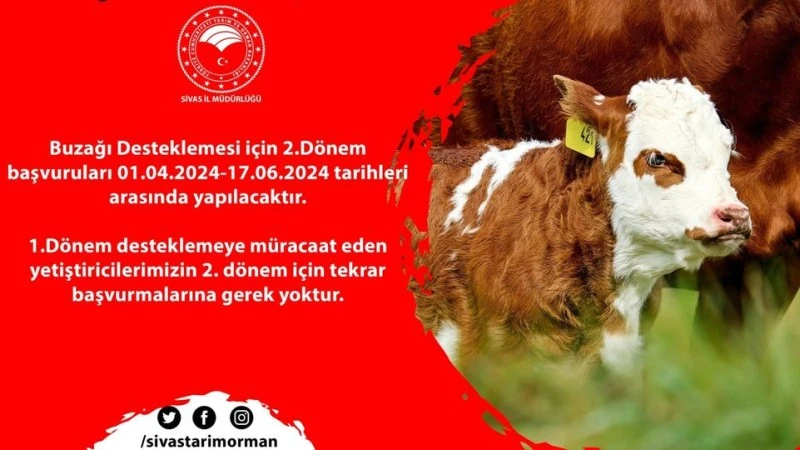 Sivas İl Tarım ve Orman Müdürlüğü sosyal medya hesabından yaptığı paylaşım ile 2023 yılı 2. Dönem buzağı destekleme başvurularının başladığını duyurdu.