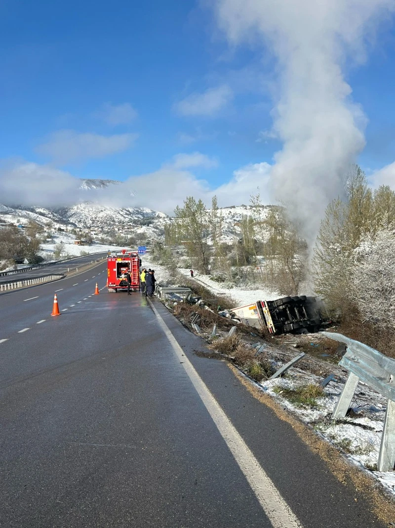 Sivas\'ın Koyulhisar ilçesinde devrildikten sonra yanan tırın sürücüsü yaşamını yitirdi.