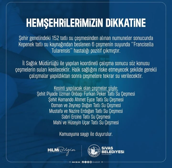 Sivas Belediyesi sosyal medya hesabından yaptığı paylaşımda şehir genelinde 152 tatlı su çeşmesinden alınan numuneler sonucunda Kepenek tatlı su kaynağından beslenen 6 çeşmenin suyunda “Frencisella Tuleresis” hastalığı pozitif çıktığını açıkladı