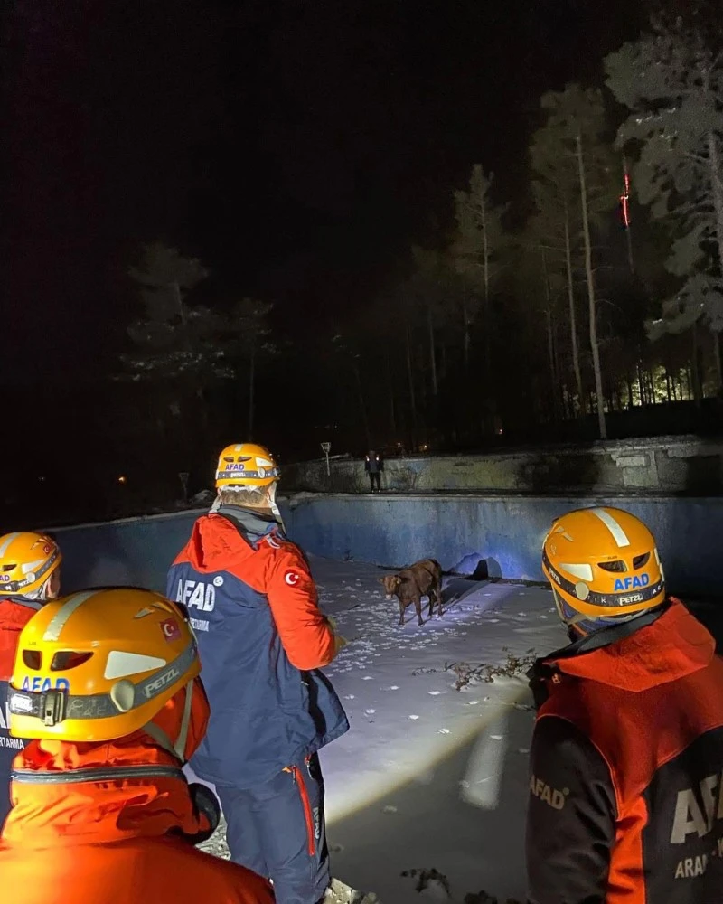 Bilgi verilmesi üzerine bölgeye AFAD ve itfaiye ekipleri sevk edildi. Ekipler halata bağladıkları ineği iş makinesi yardımıyla kurtarak sahibine teslim etti.