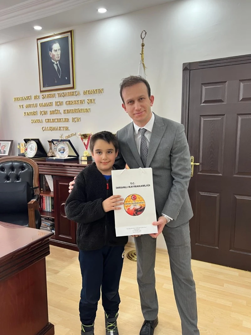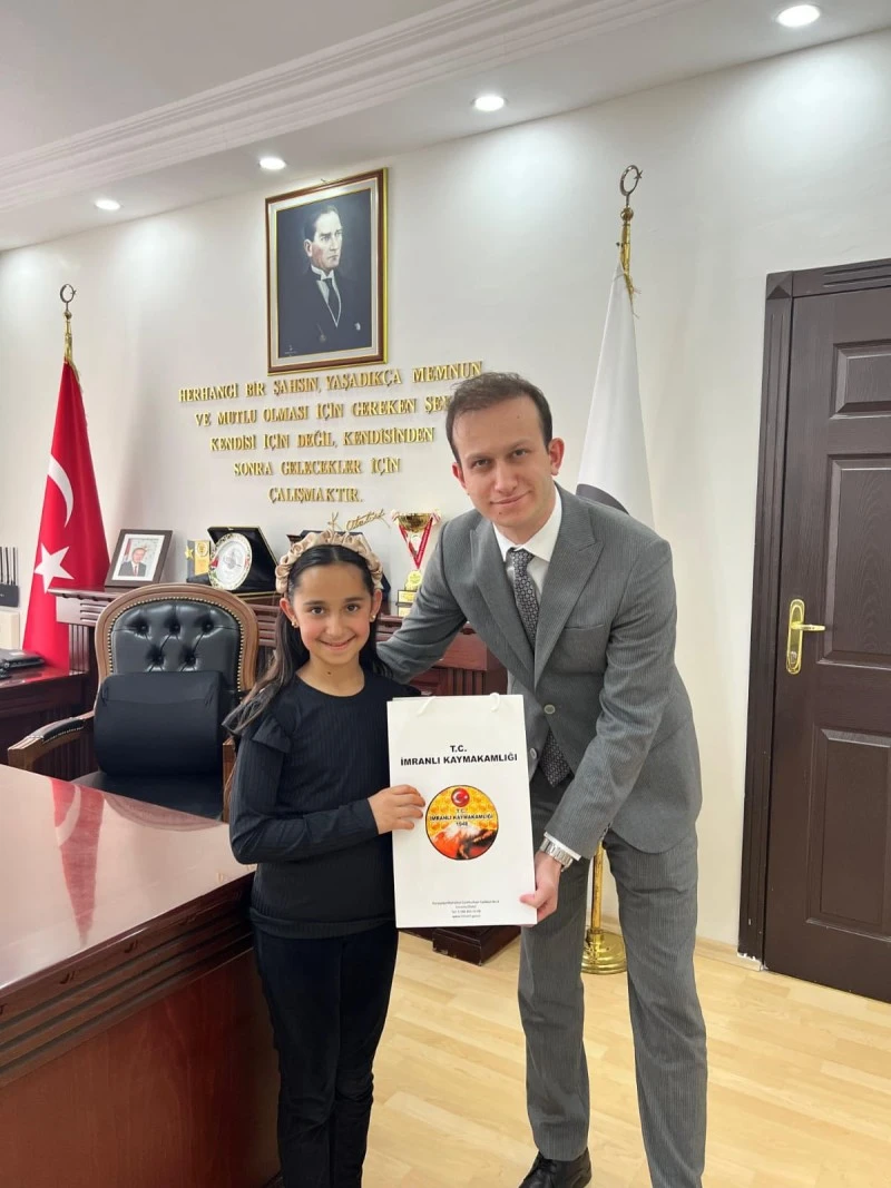 İmranlı Kaymakamı Recep Ali Çolak, birinci olan Miray Duru Yıldız, ikinci olan Yaren Su Çelik ve üçüncü olan Güney Ali Çiçekverdi,’ı makamında kabul etti.