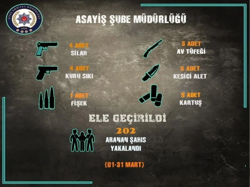 Bu kapsamda yapılan çalışmalarda Sivas'ta aranan 202 kişi yakalandı. Asayiş Şube ekipleri; 4 adet silah, 4 adet kurusıkı, 3 av tüfeği, 6 adet kesici alet, 1 fişek, 5 adet de kartuş ele geçirdi.