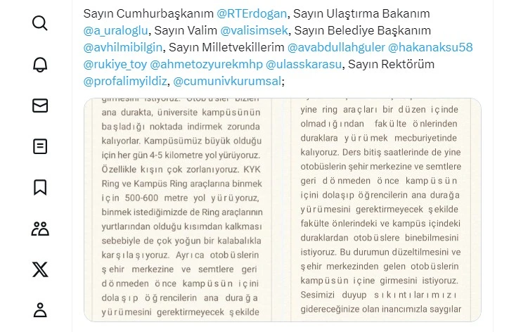 “Sayın Cumhurbaşkanım, Sayın İçişleri Bakanım, Sayın Ulaştırma Bakanım, Sayın Valim, Sayın Belediye Başkanım, Sayın Milletvekillerim, Sayın Rektörüm; bizler Sivas Cumhuriyet Üniversitesi öğrencileri olarak şehir merkezinden ve semtlerden üniversiteye gelen otobüslerin daha önceki yıllarda olduğu gibi üniversite kampüsünün içine girmesini, fakültelerin önlerinden geçen ana yoldan öğrencileri alıp bırakmasını istiyoruz. Hali hazırda otobüsler biz öğrencileri ana durakta, Üniversite kampüsünün başladığı noktada bırakıyor ve ring servislerine binmeye yönlendiriyor. Bu şekilde Kampüsümüz büyük olduğu için her gün 4-5 kilometre yol yürüyoruz. Özellikle kışın bu yolu kat etmekte çok zorlanıyoruz. KYK Ring ve Kampüs Ring araçlarına binmek için 500-600 metre yol yürüyoruz. Otobüslere binmek istediğimizde, ring araçları yurtların olduğu duraktan kalktığı için genellikle çok yoğun bir kalabalıkla karşılaşıyoruz. Otobüslerde yer olmuyor ve derslerimize geç kalma durumunda kalıyoruz.