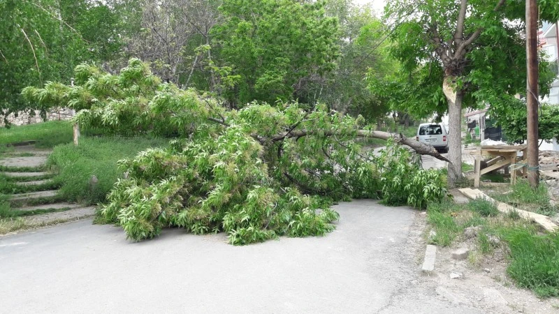 Kaleardı Mahallesi'nde rüzgarın etkisiyle 2 ağaç kökünden sökülerek yola devrildi, iletim hattı kablolarına zarar verdi. Vatandaşların ihbarı üzerine bölgeye belediye ekipleri sevk edildi. Ekipler, devrilen ağaçları kesip kamyona yükleyerek yolu trafiğe açtı.