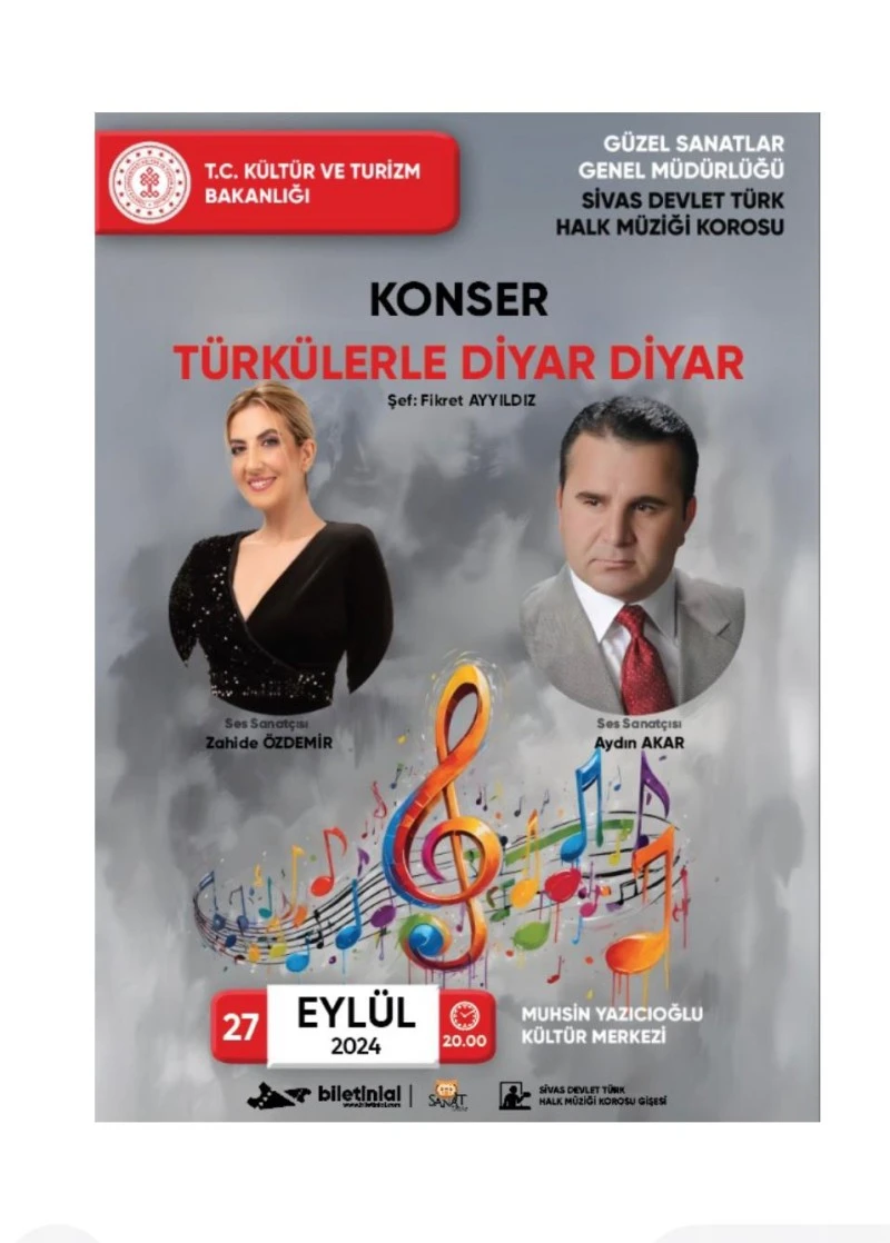 Kültür ve Turizm Bakanlığı Güzel Sanatlar Genel Müdürlüğü Sivas Devlet Türk Halk Müziği Korusu tarafından “Türkülerle Diyar Diyar” adlı konser düzenlenecek.