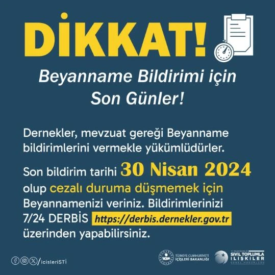 Bilindiği üzere, dernek yönetim kurulu başkanları, her takvim yılının ilk dört ayı içinde bir önceki yıla ait Dernek Beyannamelerini (EK 21), mülki idare amirliğine vermekle yükümlü olup, 30 Nisan 2024 günü mesai bitimi itibarı ile süre sona eriyor.