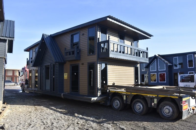 Sivas'ta faaliyet gösteren bir mühendislik firması, kent merkezinde kullanıma hazır ahşap malzemeden yapılma evler üretiyor. 32 ile 120 metrekare ebadında üretilen evler, insanların her türlü ihtiyacını karşılaşacak şekilde inşa ediliyor. Rusya'dan getirilen Sibirya çamlarından elde edilen ahşaptan yapılan evler, müşterilerin isteğine ve kullanacağı yere göre ebatlandırılıyor. Yapımı tamamlanan evler ise TIR'lar ile gideceği bölgeye naklediliyor. Taşınma ve köprü geçişlerinde problem yaşanmaması için gideceği güzergahtaki yolların genişlik hesapları yapılarak üretilen evler, nakliye sırasındaki görüntüsüyle meraklıların da dikkatini çekiyor. Şimdilerde Bulgaristan'dan da sipariş alan evler, binlerce kilometreyi bulan mesafeleri TIR üstünde taşınarak gidiyor.