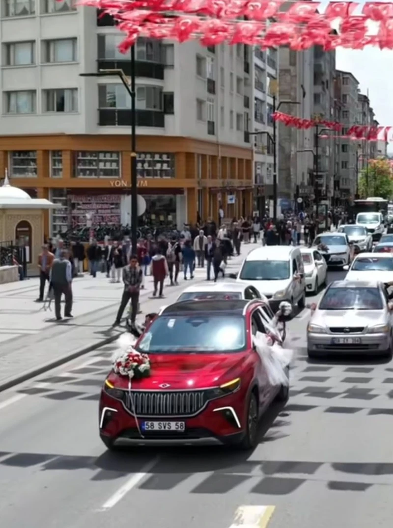 Sivas Belediyesi bünyesine hizmet veren Türkiye’nin ilk yerli ve milli otomobili TOGG, Melih Gazi Ülker ve Beyza Demirkaynak çiftinin gelin arabası oldu.